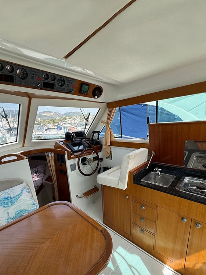 - Intérieur haut de gamme : salon avec table, cuisine entièrement équipée, glacière/réfrigérateur pour vos boissons et cabine.